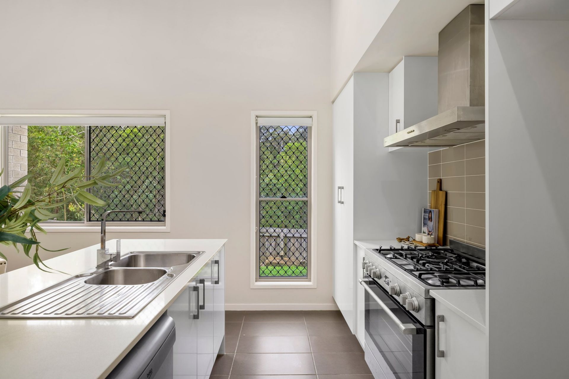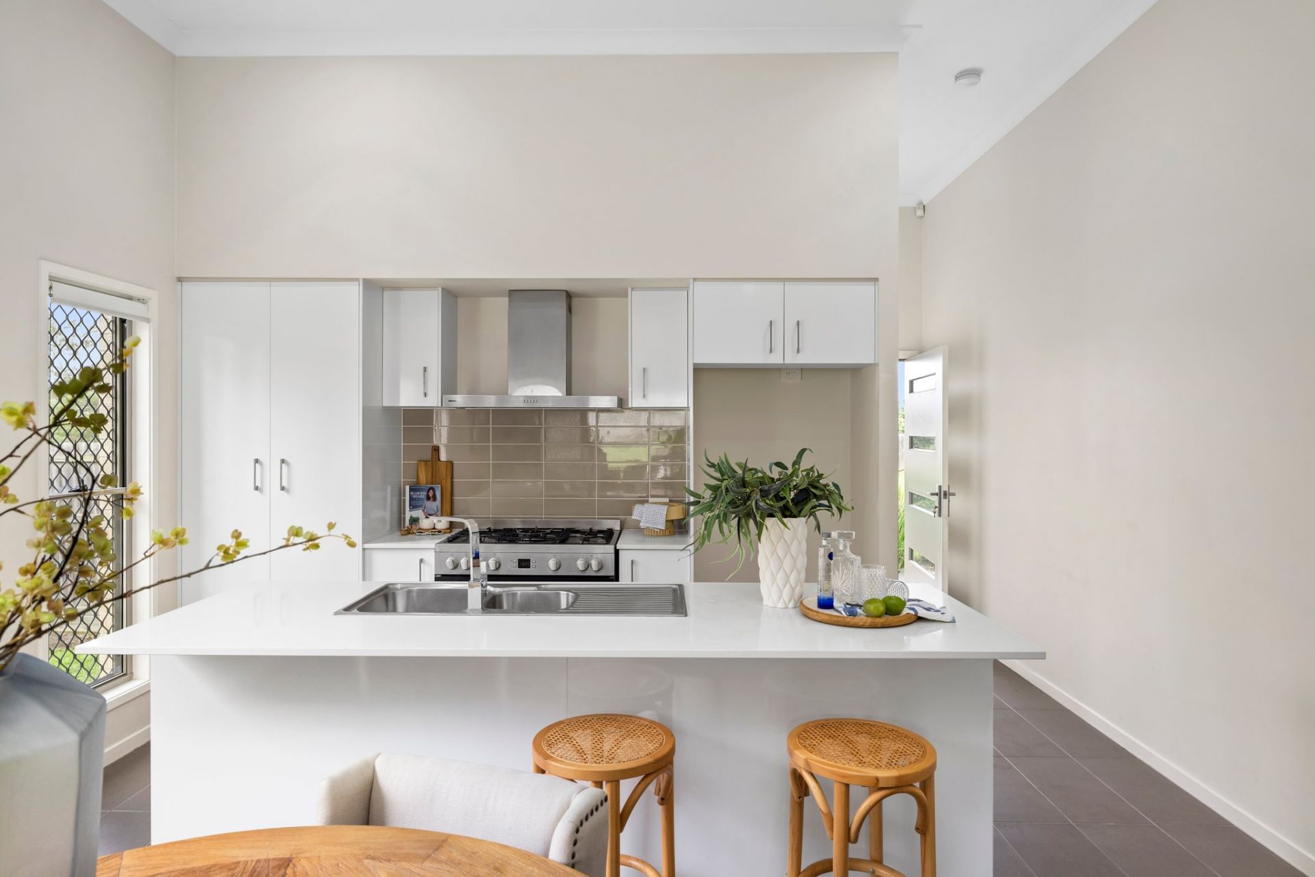 The modern kitchen is both stylish and functional, featuring stone benchtops, stainless steel appliances including a premium gas cooktop, and generous storage — perfect for everything from quick family meals to weekend entertaining.