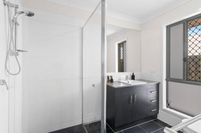 Privately positioned, the master suite offers a peaceful retreat, finished with a walk-in wardrobe and modern ensuite. The remaining three bedrooms each include built-in wardrobes and ceiling fans, providing comfort and practicality for family or guests. The main bathroom continues the home’s stylish design, complete with a full-sized bathtub, separate shower and sleek vanity. Outdoors, a low-maintenance backyard ensures you can enjoy the space without the upkeep, while still offering room for kids, pets, or weekend relaxation.