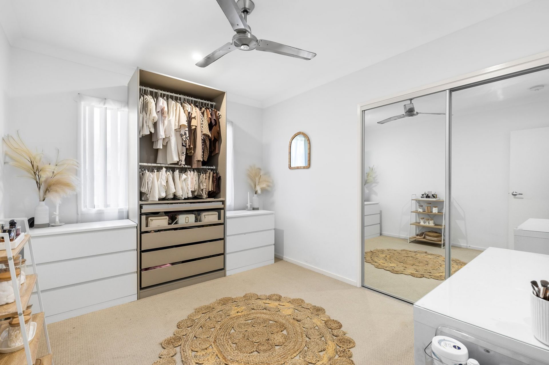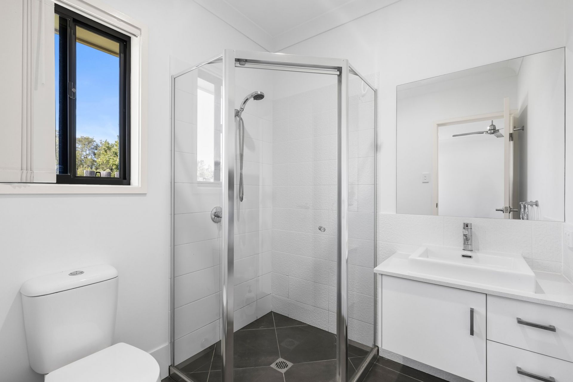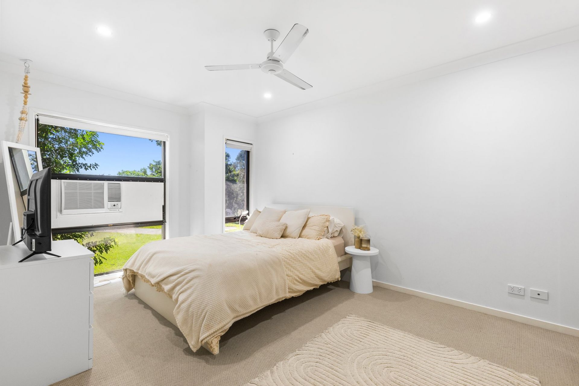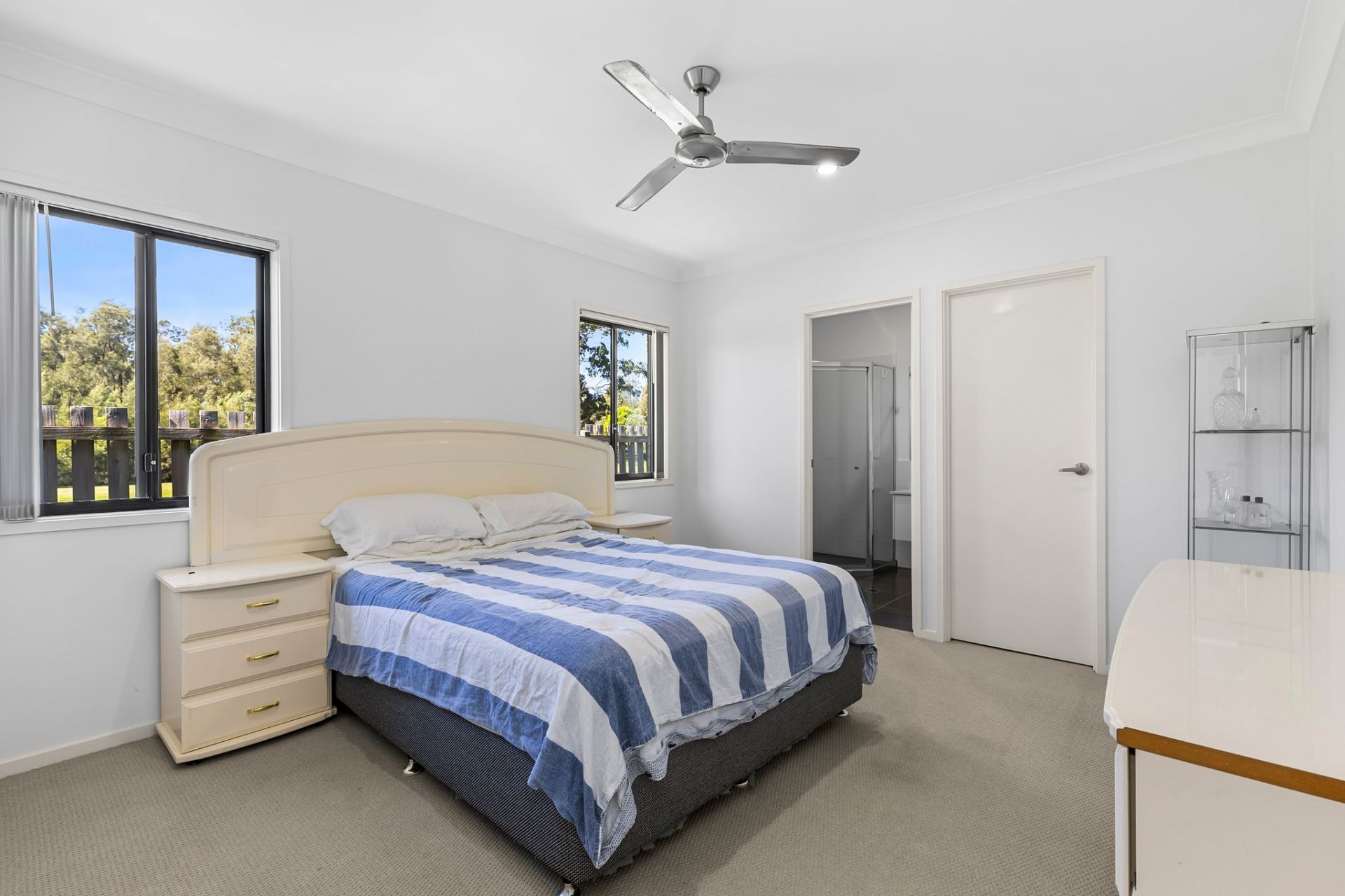 The master suite is privately positioned towards the rear of the home and includes a generous walk-in wardrobe and modern ensuite. Both bathrooms offer a clean, fresh design topped with modern finishes and sleek fixtures, while the main bathroom is equipped with a separate bath, offering a relaxing space to unwind at the end of every day. Each of the remaining three bedrooms are fitted with built-in wardrobes and ceiling fans throughout, providing comfortable and practical year-round living.
