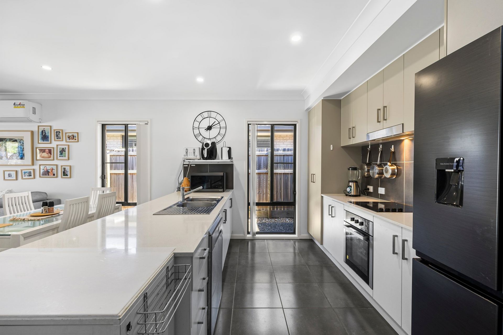 - Contemporary kitchen with stone benchtops, stainless steel appliances and ample cabinetry